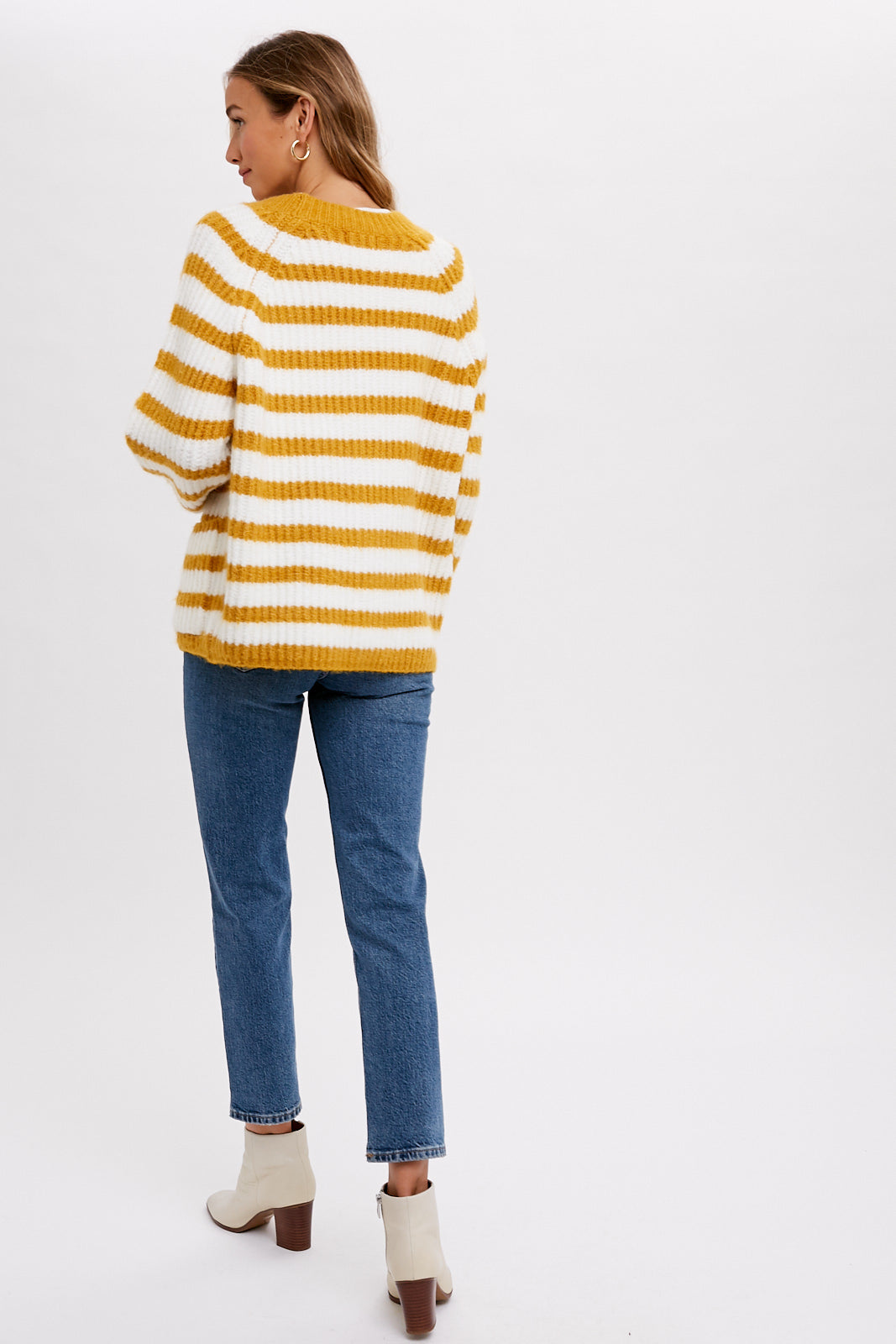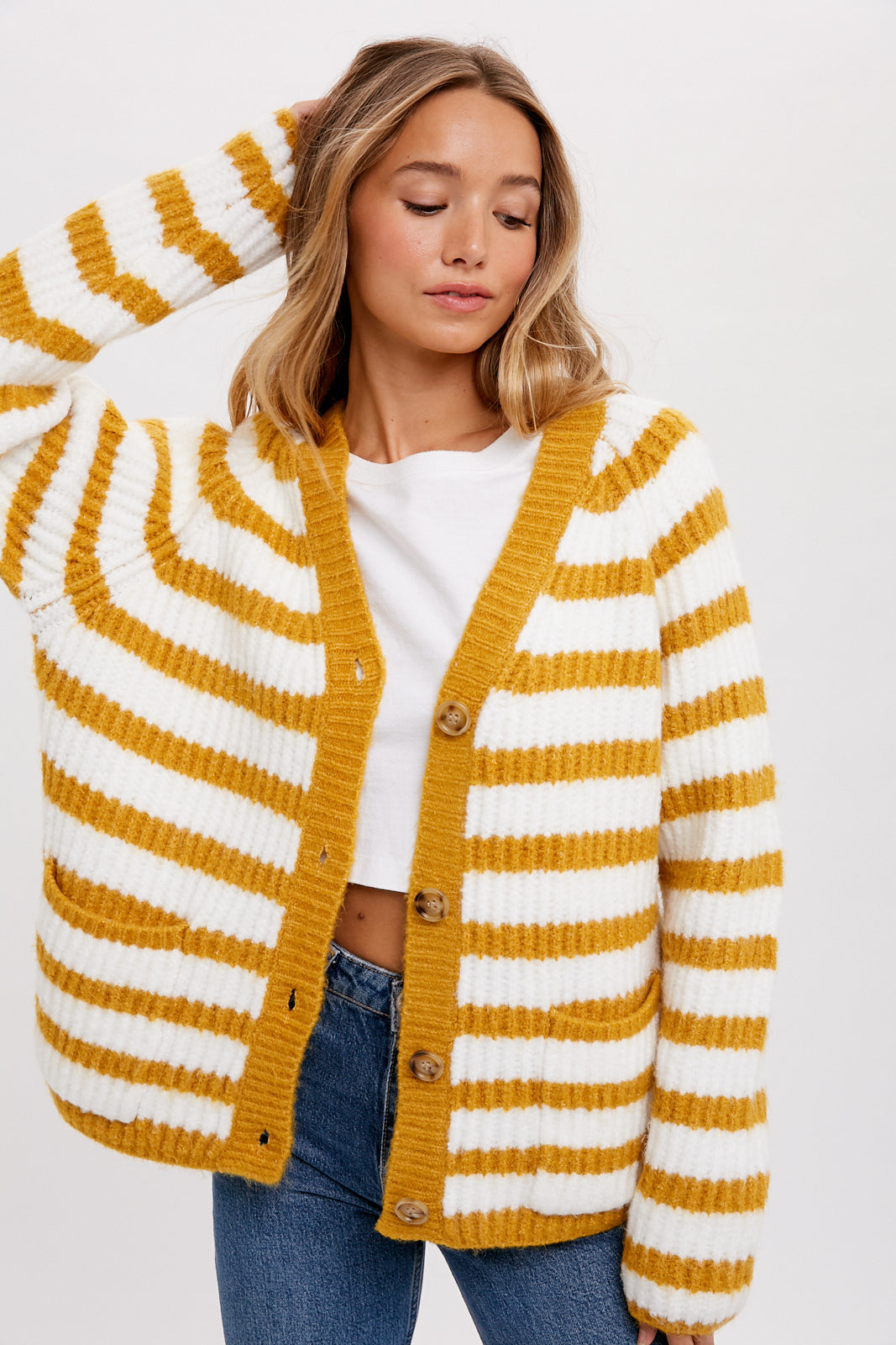 A chunky sweater cardigan featuring an allover stripe pattern, button front, front patch pockets and a relaxed fit.